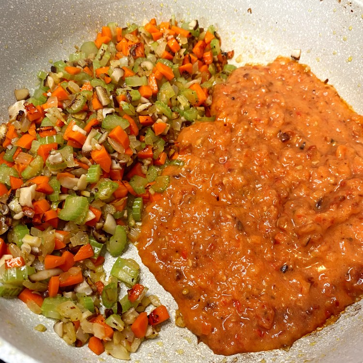 While your veggies are cooking down, put the dates, 3 sun dried tomatoes, and fresh tomatoes in a blender and pulse. Do not liquify, just pulse to the consistency of salsa. NOTE: I used fresh tomatoes here because I had a few left from my garden that finally turned red. If you don’t have fresh tomatoes, you can use some of the crushed tomatoes to blend.